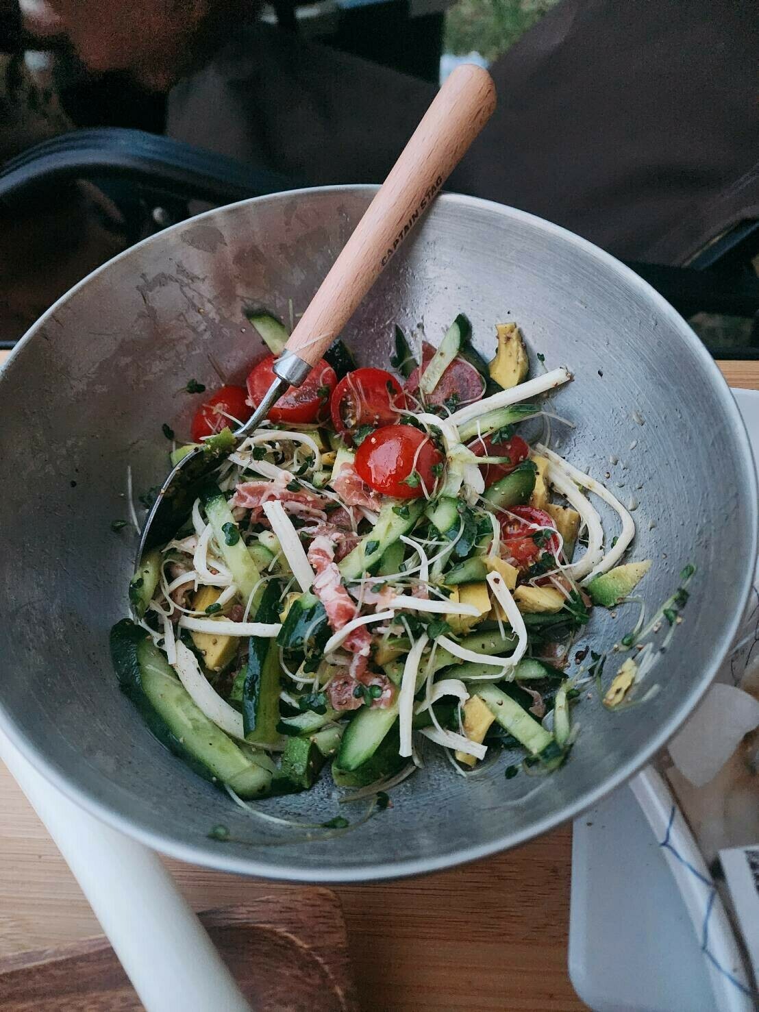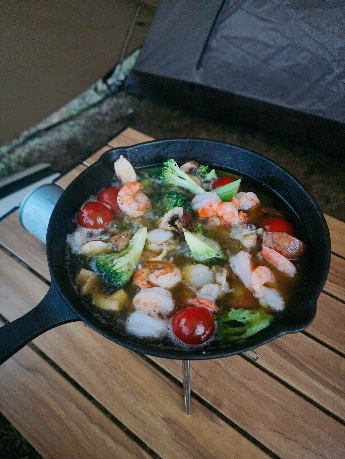 ご飯はアヒージョや、サラダ、ご飯炊いてカレー(インスタント)や、焼き芋などなど……