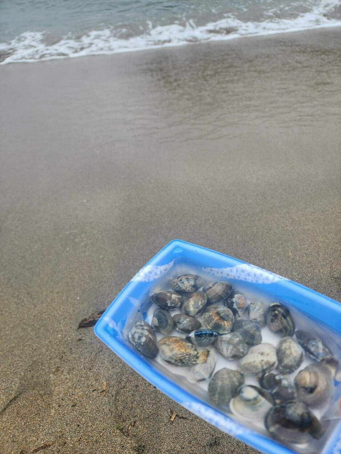翌朝塩抜きするために寝かせていて顔を出しているアサリちゃん達……