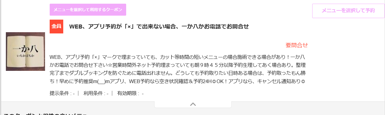 もう、今はネット、アプリの時代なので一度行かれる美容室のネットかアプリの予約画面をご覧ください