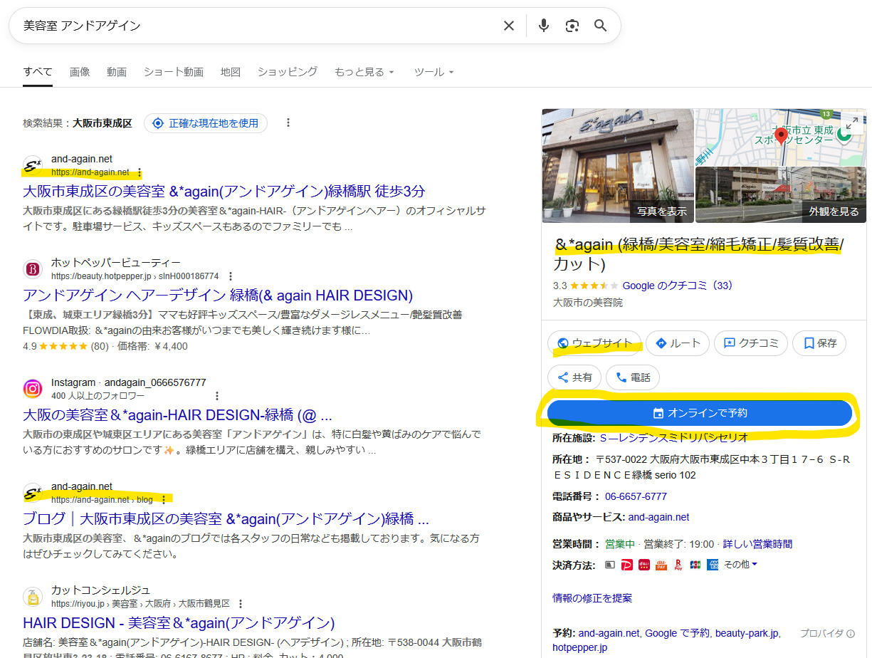 出来ない場合は、グーグルから 美容室 アンドアゲイン で検索