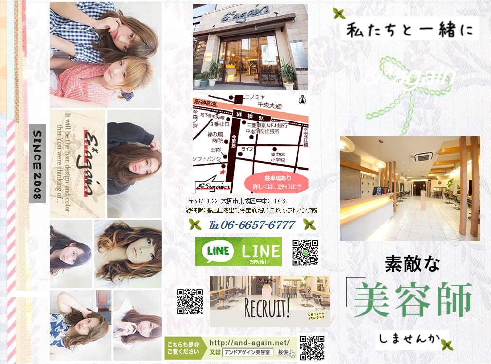 大阪市東成区緑橋駅の美容室【&*again -hair design-(アンドアゲイン ヘアーデザイン)】はキレイな髪を創り続けるヘアサロンです。