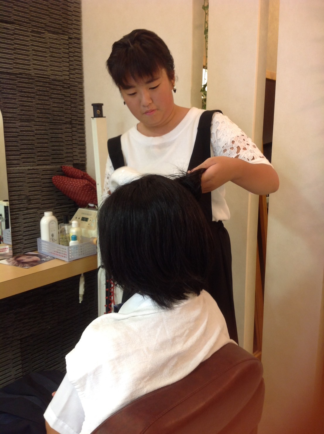 続いて、普段は美容室でアルバイトをしていて一年でシャンプーとカラーができますということでレッツチャレンジ!