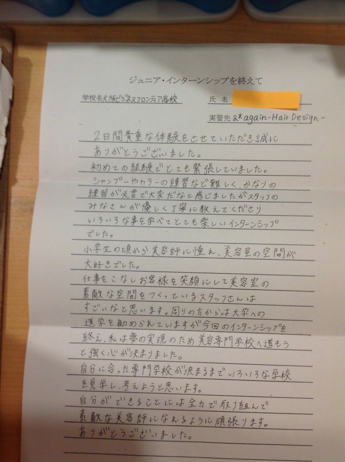 美容師になりたい子のインターンシップをうけての感想|大阪市東成区の美容室 &*again(アンドアゲイン)緑橋駅 徒歩3分