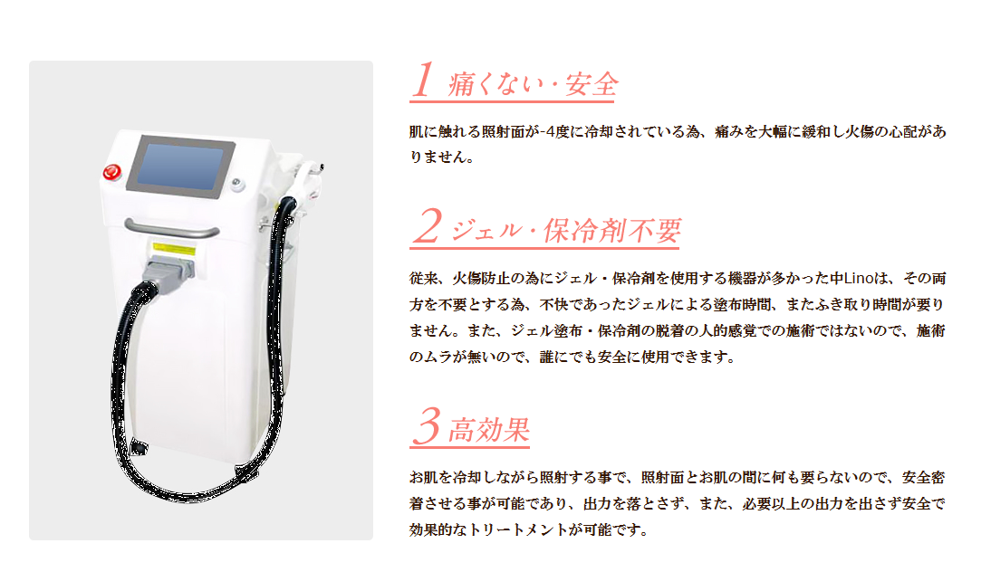 従来、火傷防止の為にジェル、保冷剤を使用する機器が多かった中アンドアゲインの光脱毛、