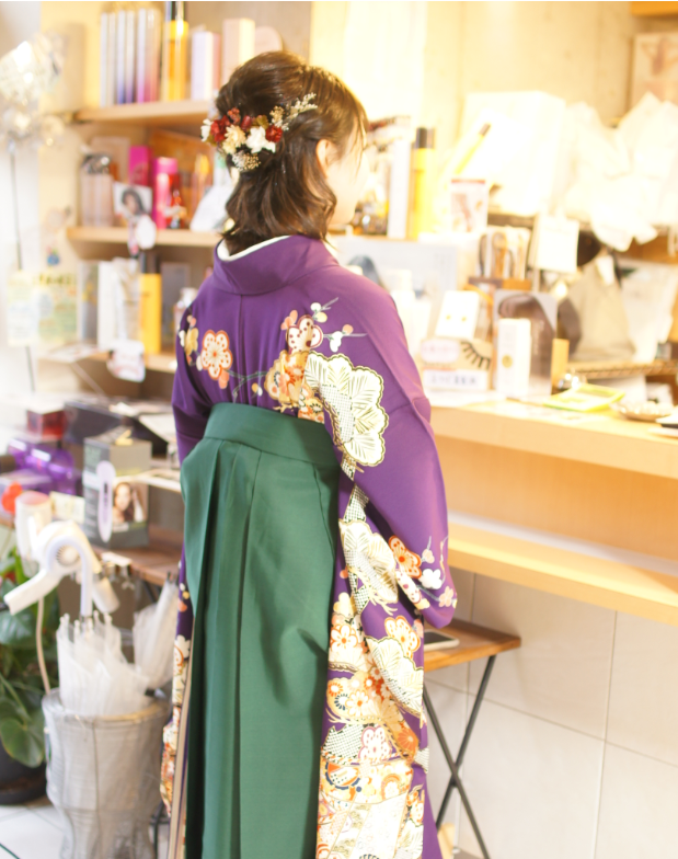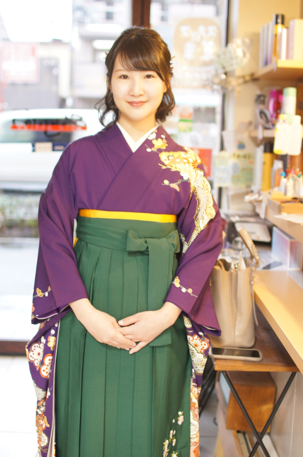 卒業式といえば袴の着付けも紫の振袖と緑の袴が映えますね(^_-)-☆