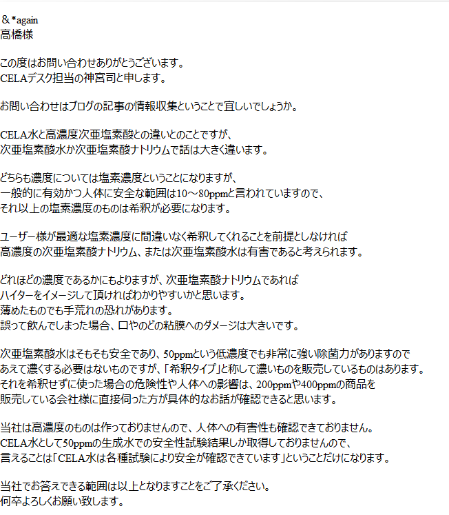 CELA水と高濃度次亜塩素酸との違いとのことですが、