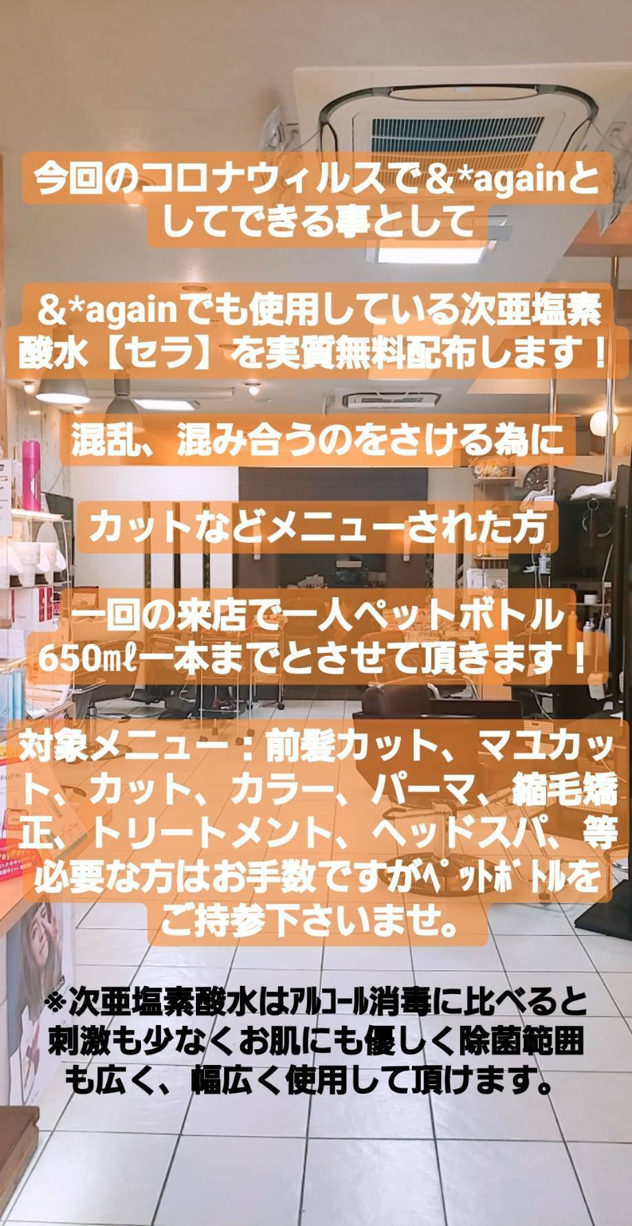 コロナウィルス対策で&*againとしてできる事として次亜塩素酸水(消毒)実質無料配布します|大阪市東成区の美容室 &*again(アンドアゲイン)緑橋駅 徒歩3分