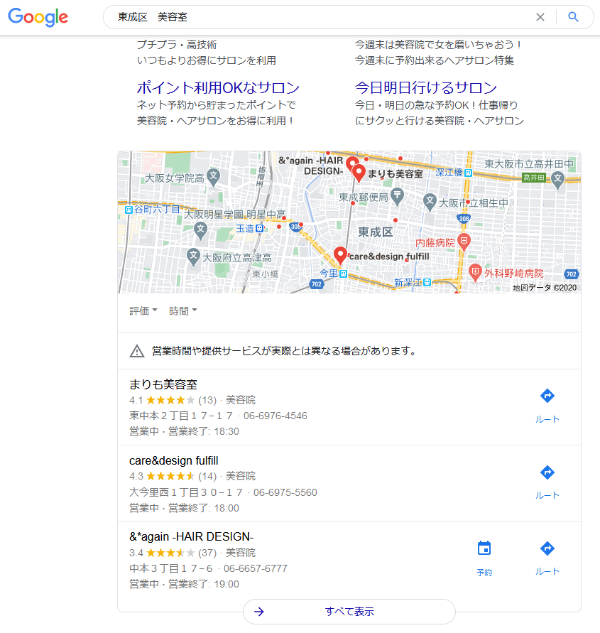 東成区美容室で検索したら、グーグルマップの三番目に今&*again-HAIR-が表示で新しく